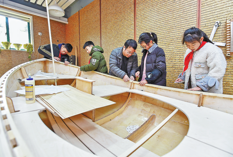别看船不大,工程却复杂,需要经过船形确定、图纸设计、板材选择、船形固定、打磨修整等多道工序,靠的是“匠心”。“现在是打磨阶段,学生用砂皮纸磨,已经很光滑了。”张老师摸着船板说,学生正在想着怎么样给船做美化。