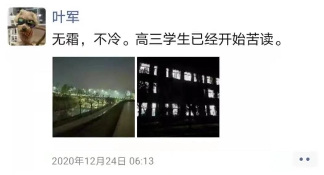 这张照片发出的时间是早上6:13,天还没有亮,一幢黑漆漆的三层教学楼,十来间教室却已亮起灯来。“无霜,不冷。高三学生已经开始苦读。”