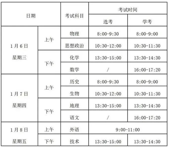 本次选考和学考各科目考试时间具体安排如下: