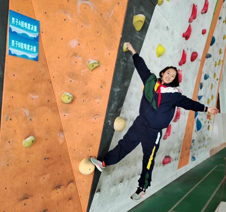 大课间时,记者见到了齐梓艺。这是一个长相清秀,活泼开朗的小女孩。小学五年级,她偶然接触了攀岩,感觉这运动挺有趣的。她第一次尝试,就完成得挺不错,攀到最高点,特别有成就感。妈妈就帮她报了攀岩课,她开始了正式的训练。这一练,就是三四年了。