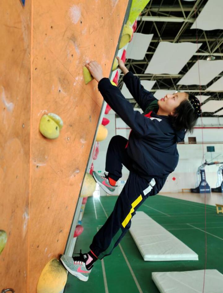 复课后,她发现自己的体能还是有一些退步,于是又抓紧跟教练一起训练。暑假天气很热,但上午下午都要训练,室外有太阳时就到室内练,没太阳时就在室外练。她经常练得满身是汗,用来攀岩的抓手都被太阳晒得发烫了。