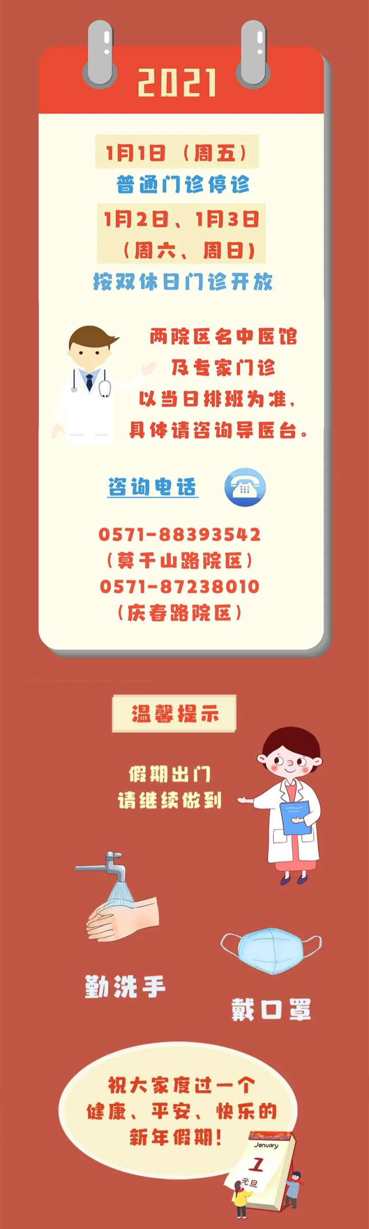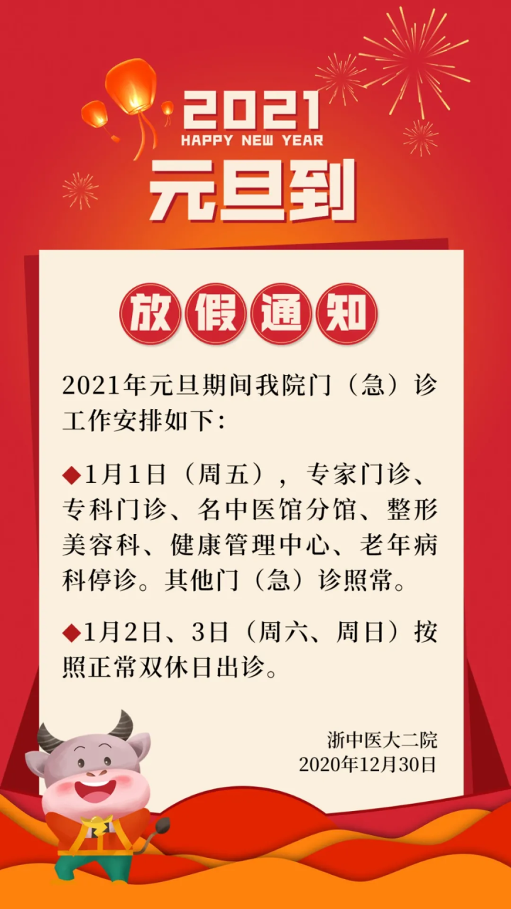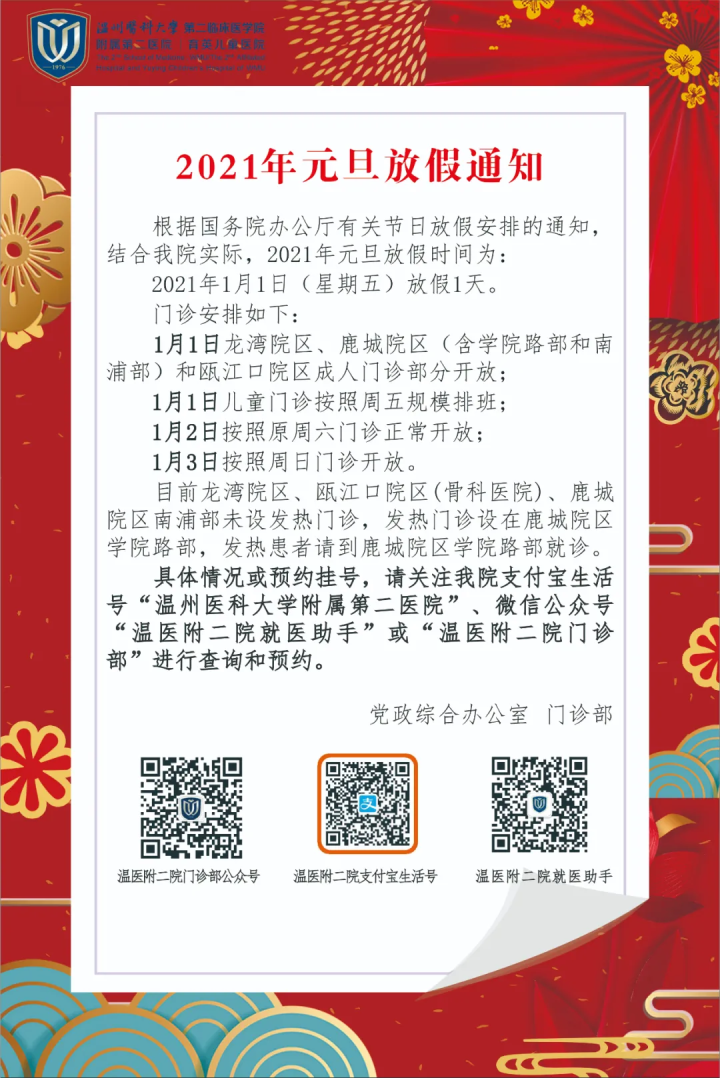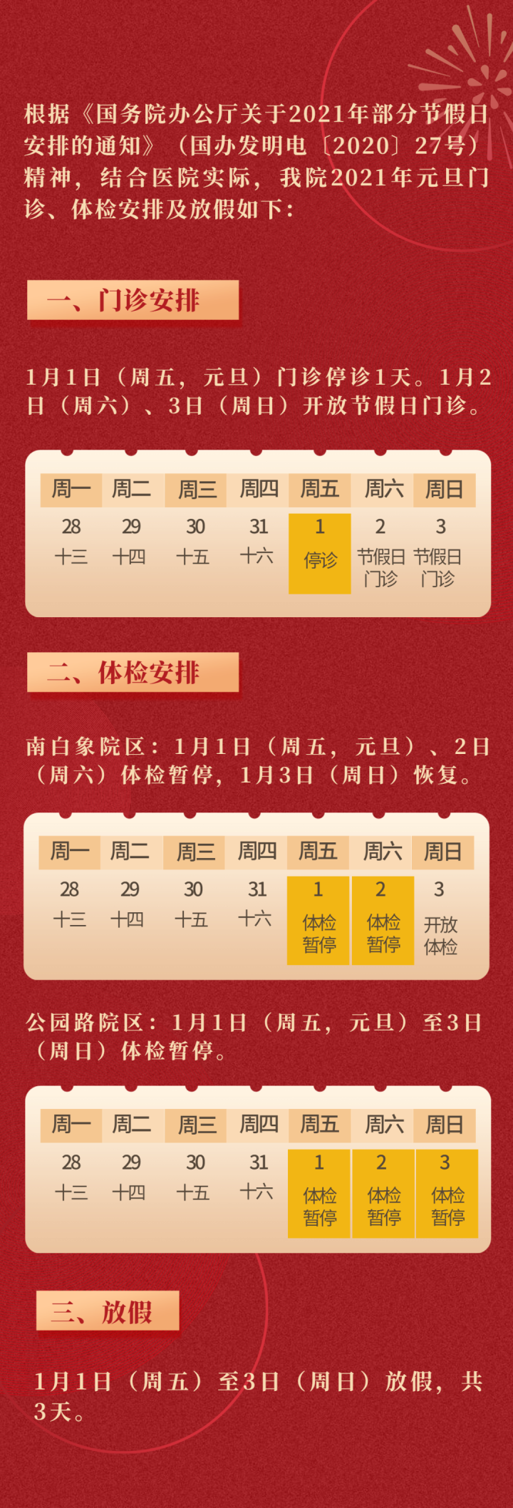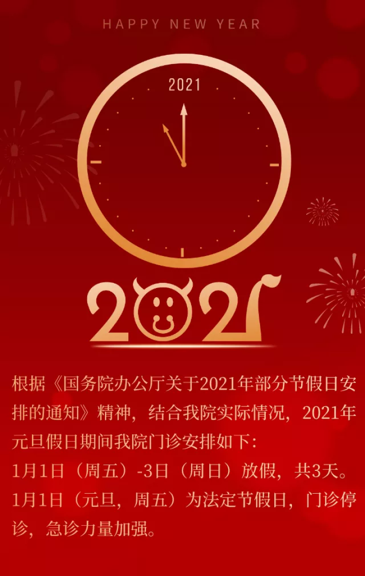 2021年1月1日(星期五)至1月3日(星期日)假期,门诊停诊三天。