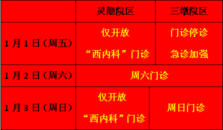 1月1日至1月3日(周五、周六、周日):开放周末门诊;