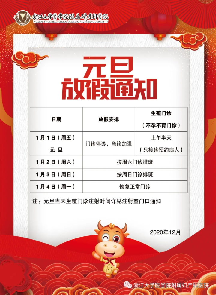 1月1日(周五):门诊停诊,急诊加强,上午辅助生育门诊开放