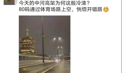 上周六晚,记者在朋友圈里刷到这条——今天的中河高架为何这般冷清?80码通过体育场路上空,恍惚开错路。