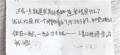 “这男生是位小学霸,之前也听别的同学来反映过,这个男生和班上一位成绩很不错的女生‘关系很好’。不过,在跟男生谈心过程中,男生不承认。没想到之后突然给我来了一封信,问了这个大人都觉得很难回答的问题。”