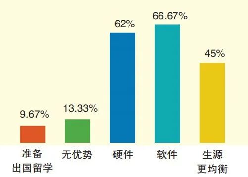 民办学校有哪些优势?对此问题,家长们的选择:首先是课程、师资等“软件”,其次是设施设备等硬件,再次是生源均衡,最后是考虑今后出国留学。同时,也有 13.33%的家长认为,现在的民办学校和公办学校比,不存在优势。
