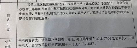 “我们五年级所有学生都不知情自己语数英分数,而全区其他五年级学生都知情,已和老师反映,告知是校方规定,我不认可,要求给予合理解释并答复。”