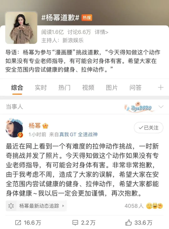 今天下午,杨幂再次发微博为此事道歉:“最近在网上看到一个有难度的拉伸动作挑战,一时新奇挑战并发了照片。今天得知做这个动作如果没有专业老师指导,有可能会对身体有害。非常非常抱歉,由于我考虑不周,造成了大家的误解,希望大家在安全范围内尝试健康的健身、拉伸动作,希望大家都能身体健康~我以后一定会更加谨慎,再次抱歉。”