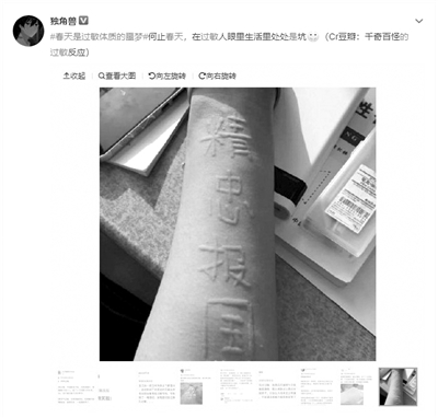 都市快报报道 这两天,“春天是过敏体质的噩梦”成为了微博热搜话题。在这个话题底下,网友纷纷讲起了自己五花八门的过敏原因,还有人晒出了图片。