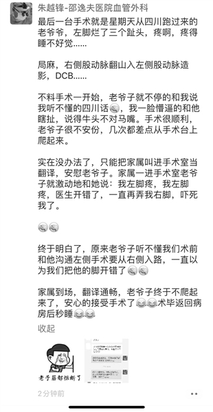 3月22日收治入院,经过系统检查,第二天,朱越锋安排老爷爷手术。手术过程中,发生了朱越锋朋友圈里说的“搞笑”一幕。