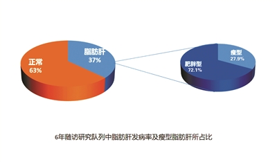 杭师大附院体检中心对10564位健康体检者进行了为期6年的随访,这些体检者每年入院体检,查出脂肪肝的有3942人,脂肪肝患病比例达37%,这当中有1100多例是瘦型脂肪肝,约有15%纤维化出现明显上升。