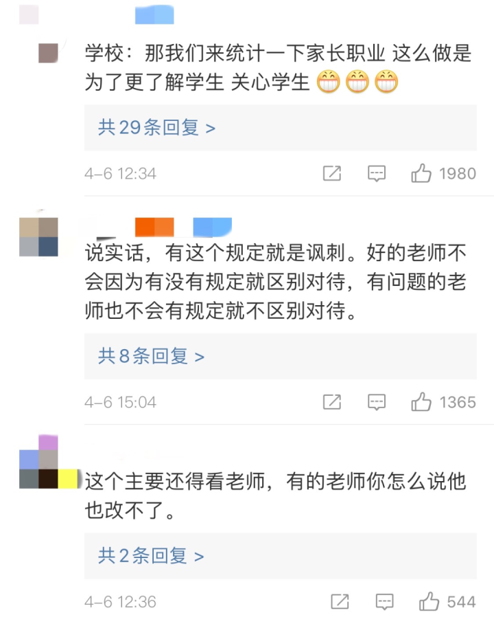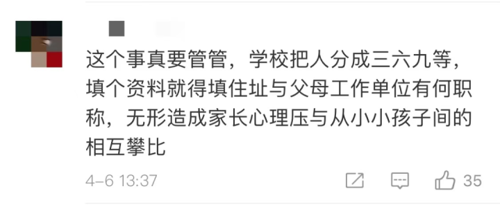 记者也随机问了身边的几个家长,一个家长说,孩子在入学时就需要填写家长的职业、工作单位、学历等信息,自己以前上学时也这样填过。虽然也不算什么大事,但心里总觉得有点膈应。“前段时间我看新闻,有个老师因为家长收入歧视学生,说明现在这样的问题还是存在的,如果能通过规定加以遏制,也挺好。”
