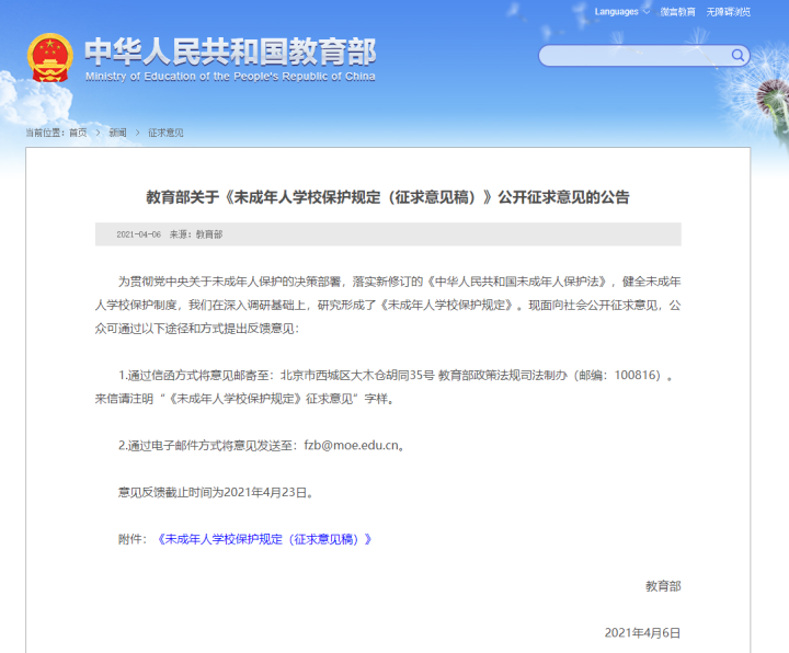 记者了解到,这个话题来源于今天教育部网站发布的《未成年人学校保护规定(征求意见稿)》,除了“学校不得因家长职业等对学生区别对”以外,这份《意见稿》内容丰富,信息量很大,对未成年人的人身安全、人格权益、受教育权、休息权利等十一项保护范畴作了规定。