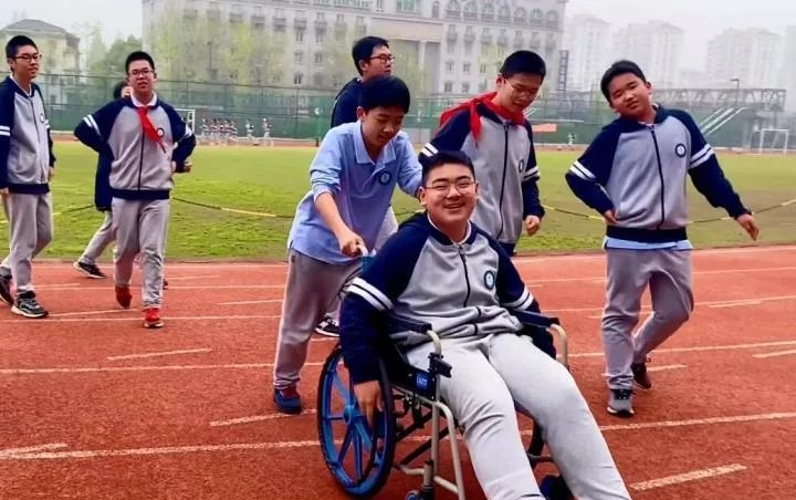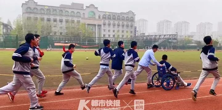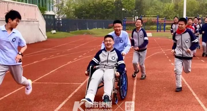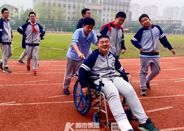 都市快报报道 这两天,杭州观成实验学校有个坐轮椅的男生火了,30多名同学自发组成“陪跑团”,轮流推他跑完1000米,小伙拿到第一名,大呼:“人生美满了!”
