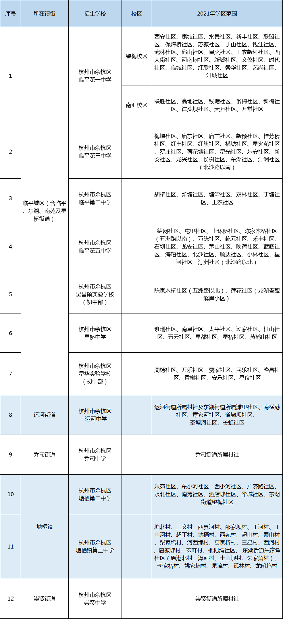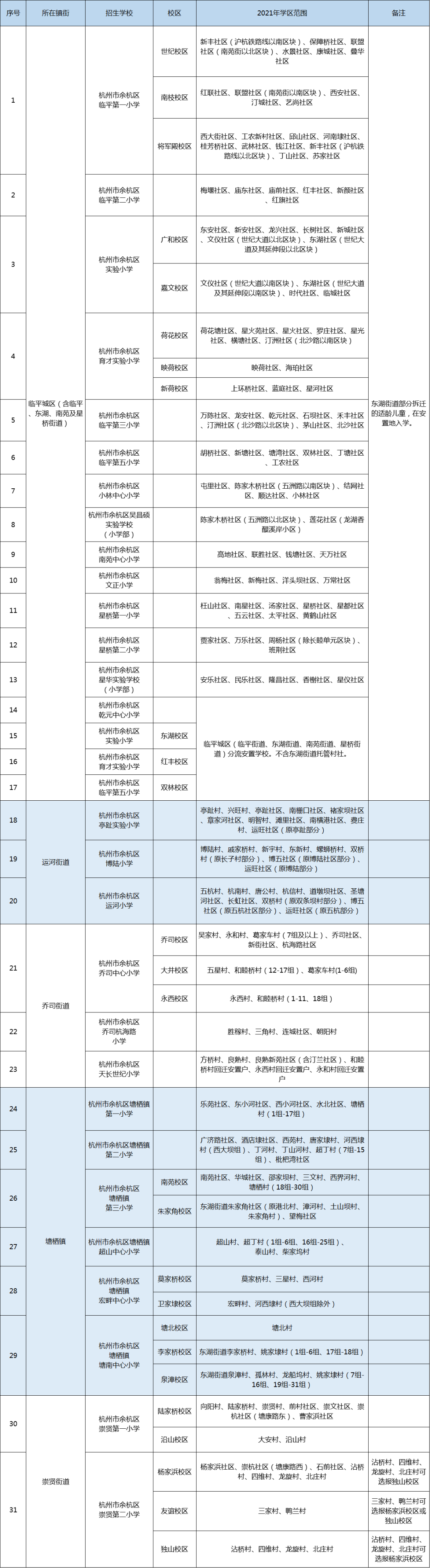 2021年临平区辖区内部分村(社区)行政区域进行调整,各义务段学校(校区)按照学区边界不变原则,对部分学校(校区)学区范围的表述进行调整。