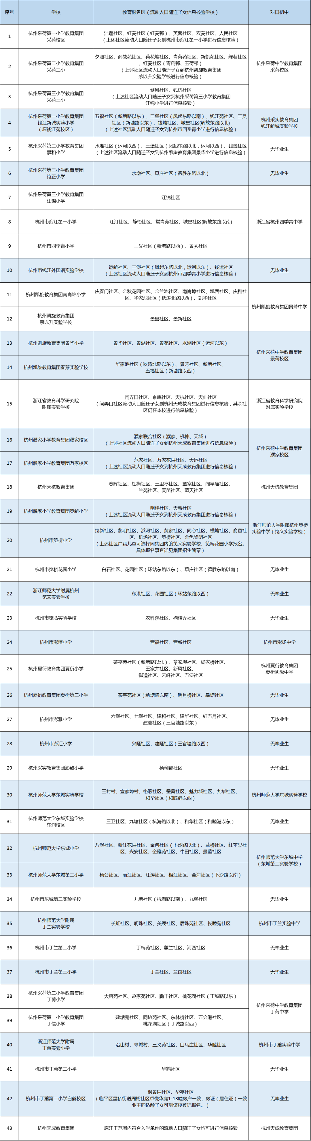 3.预计公办学校第一次现场信息核验之日至8月31日期间持有效居住证,且符合小学一年级入学条件的原江干范围内流动人口随迁子女的信息核验学校为杭州御道学校(咨询电话:56979751)。