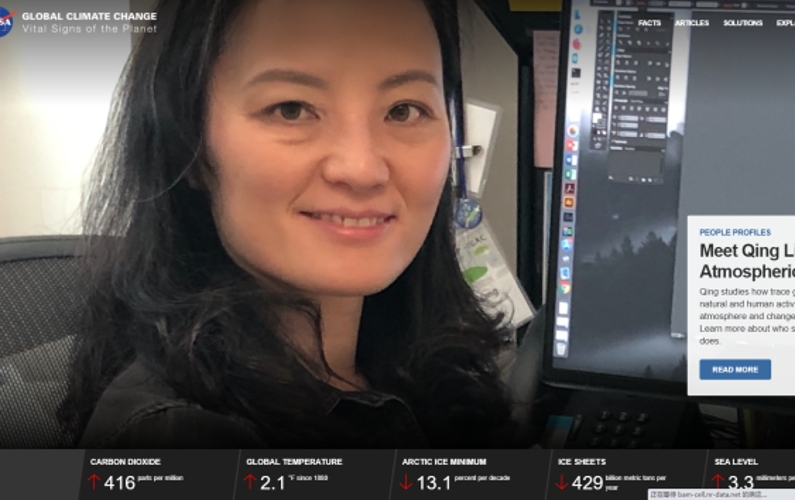 这位女学霸叫梁晴(Qing Liang),快报记者登录了climate.nasa.gov(美国航空航天局气候变化网站),在网站首页的大屏轮播图中,对梁晴进行了“高光”展示。