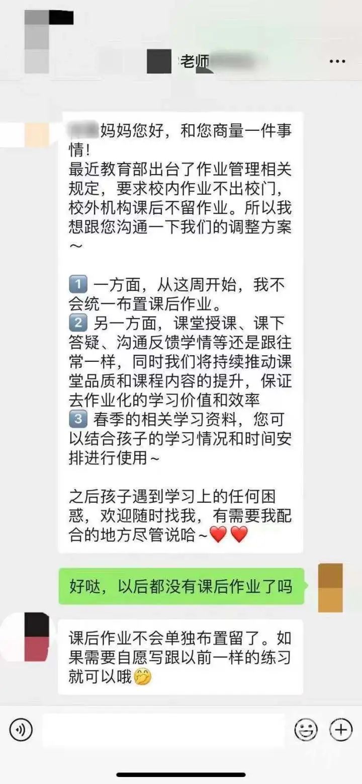 在某大型培训机构的一个家长群里,老师是这样说的:“各位家长们好~为了响应最近教育部出台的作业管理相关规定,要求校外机构不留作业,所以之后不会再布置课后作业,春季资料还是正常发的,您可以结合孩子的学习情况和时间安排自愿使用。