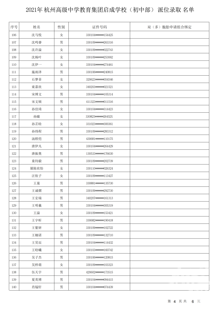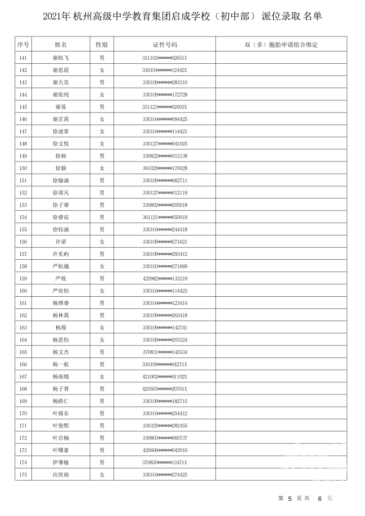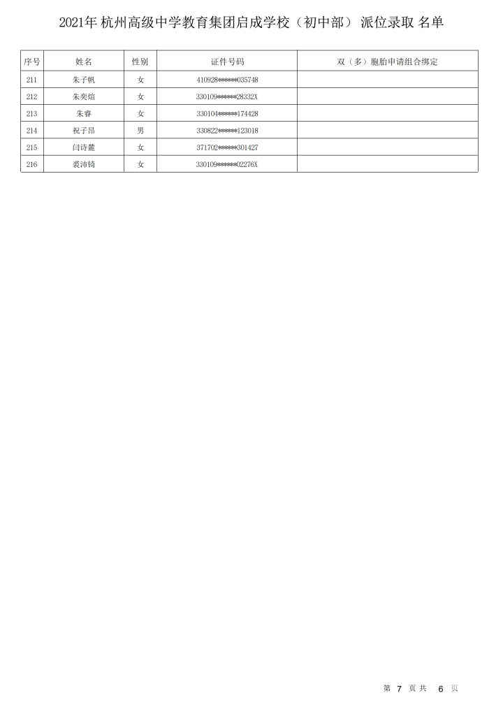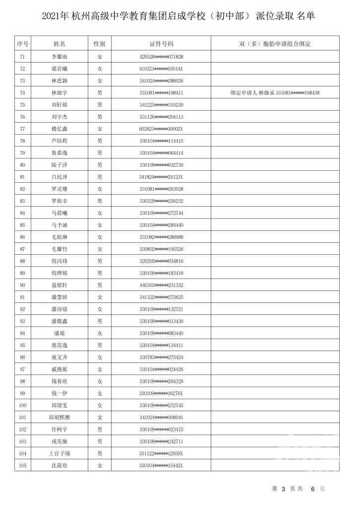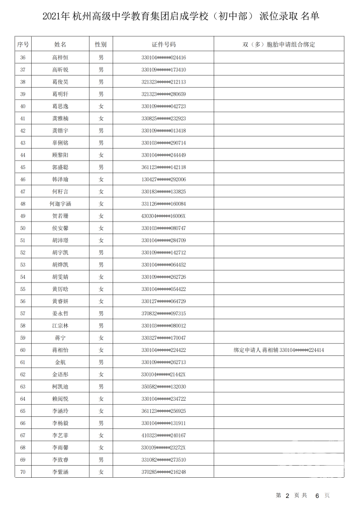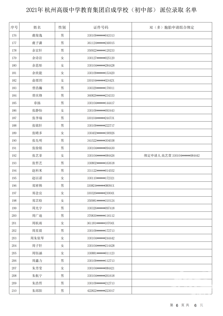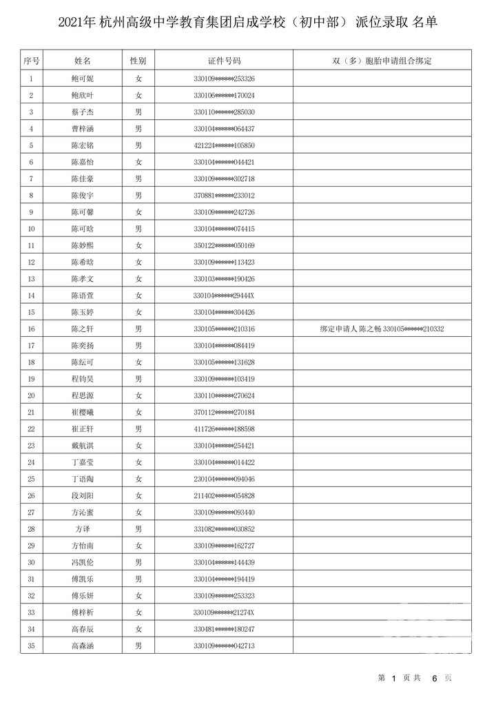 杭州高级中学教育集团启成学校(初中部)录取名单
