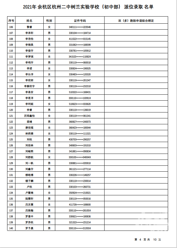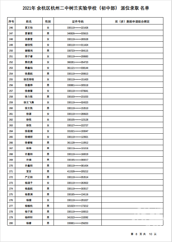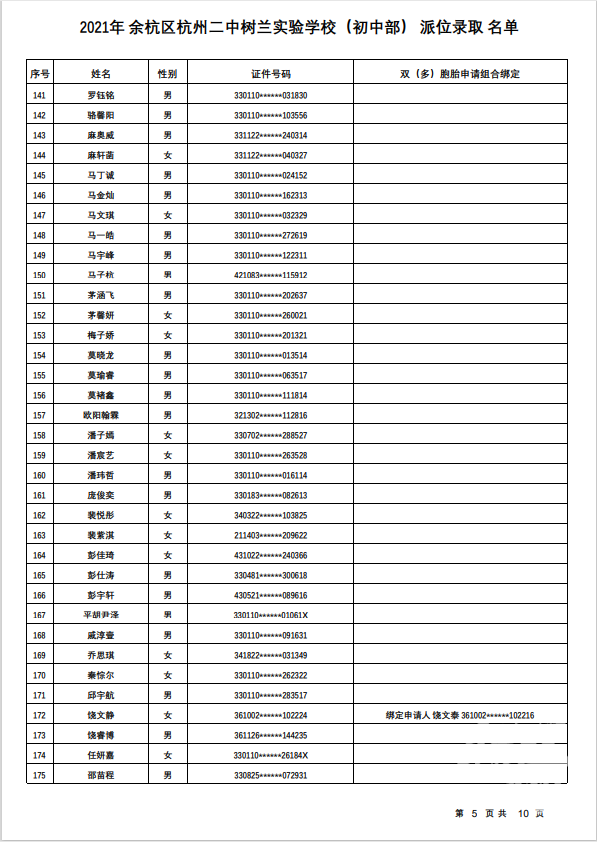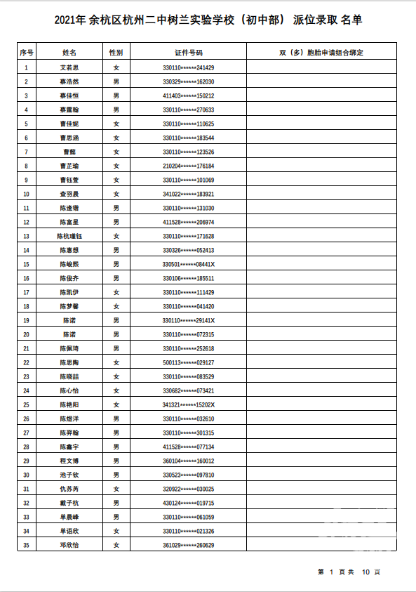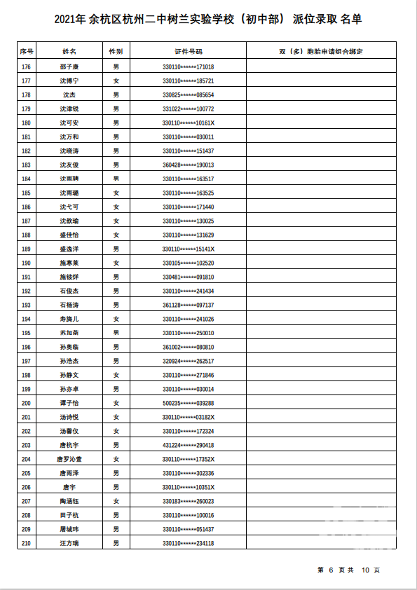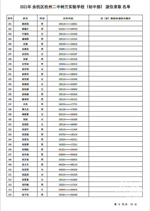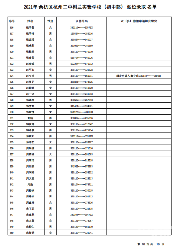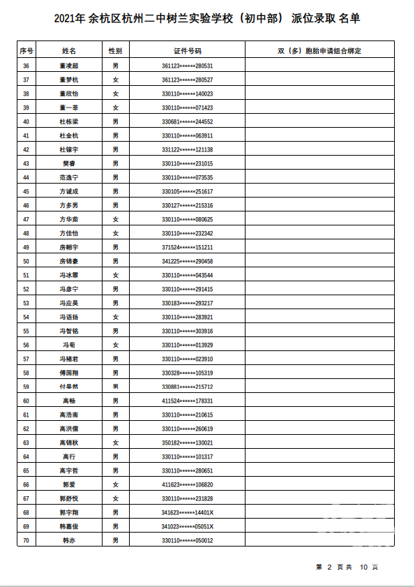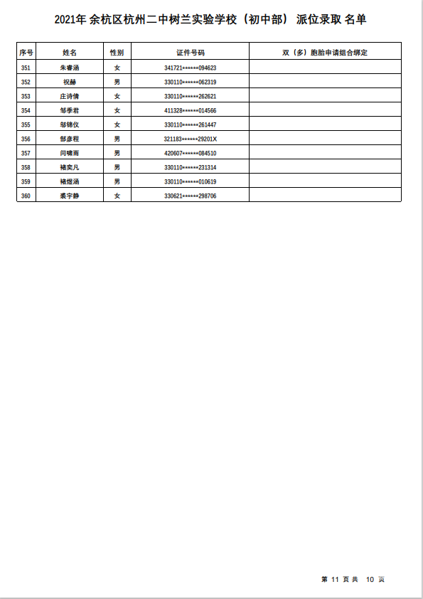 余杭区杭州二中树兰实验学校(初中部)录取名单