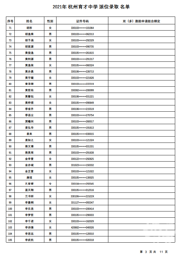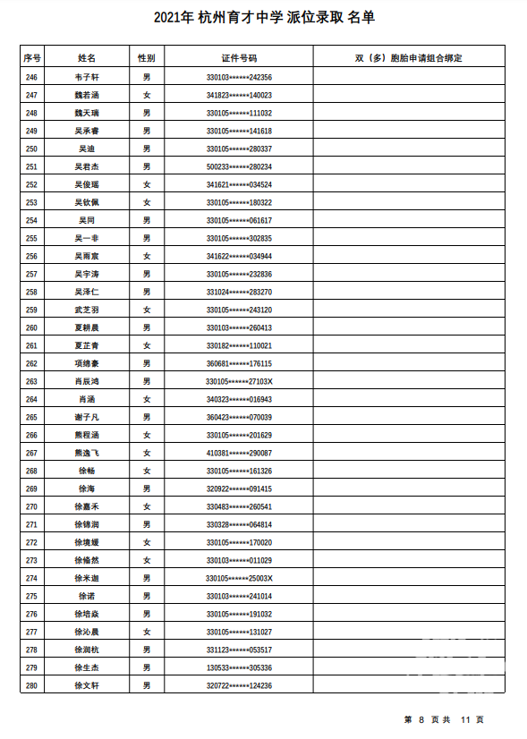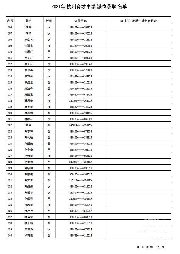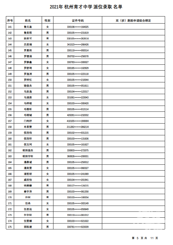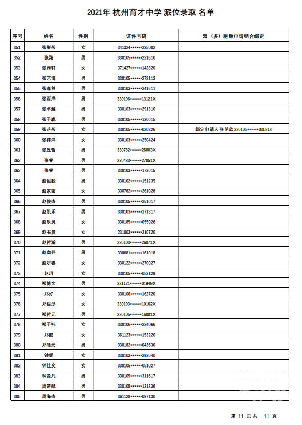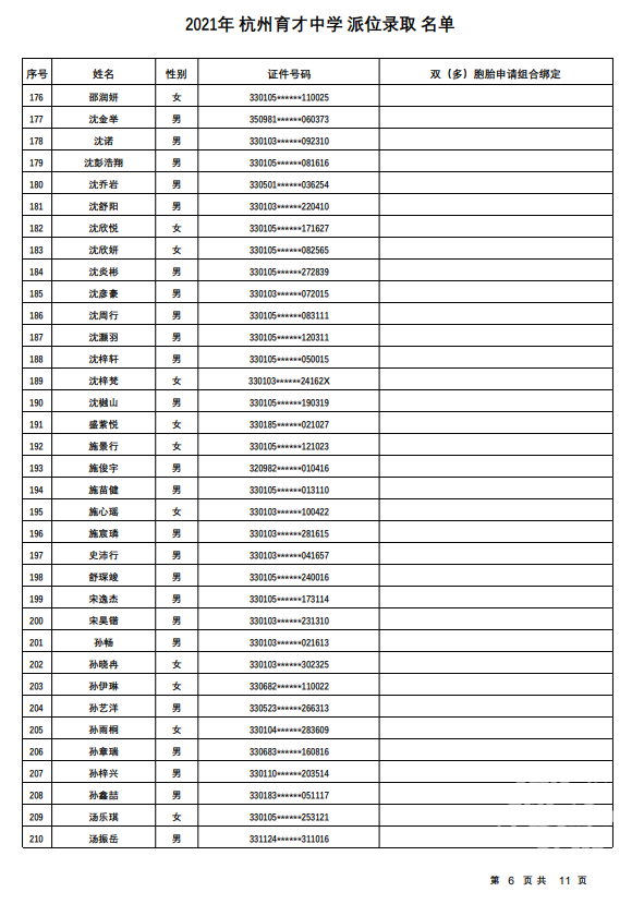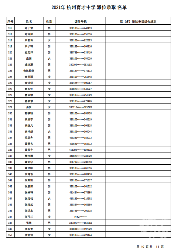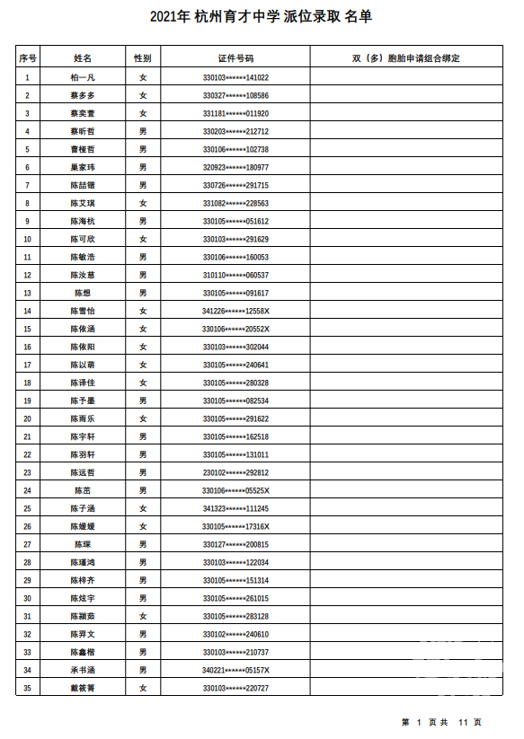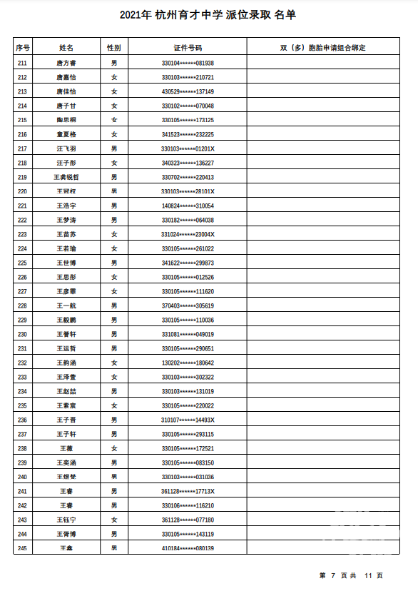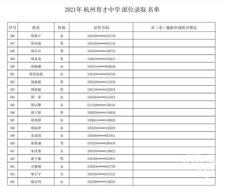 杭州市育才中学录取名单