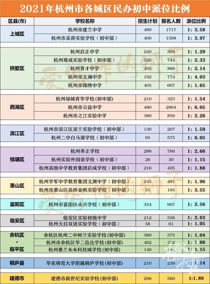 6月9日,杭州各城区已经公布民办初中报名人数,来看看这张派位比统计——