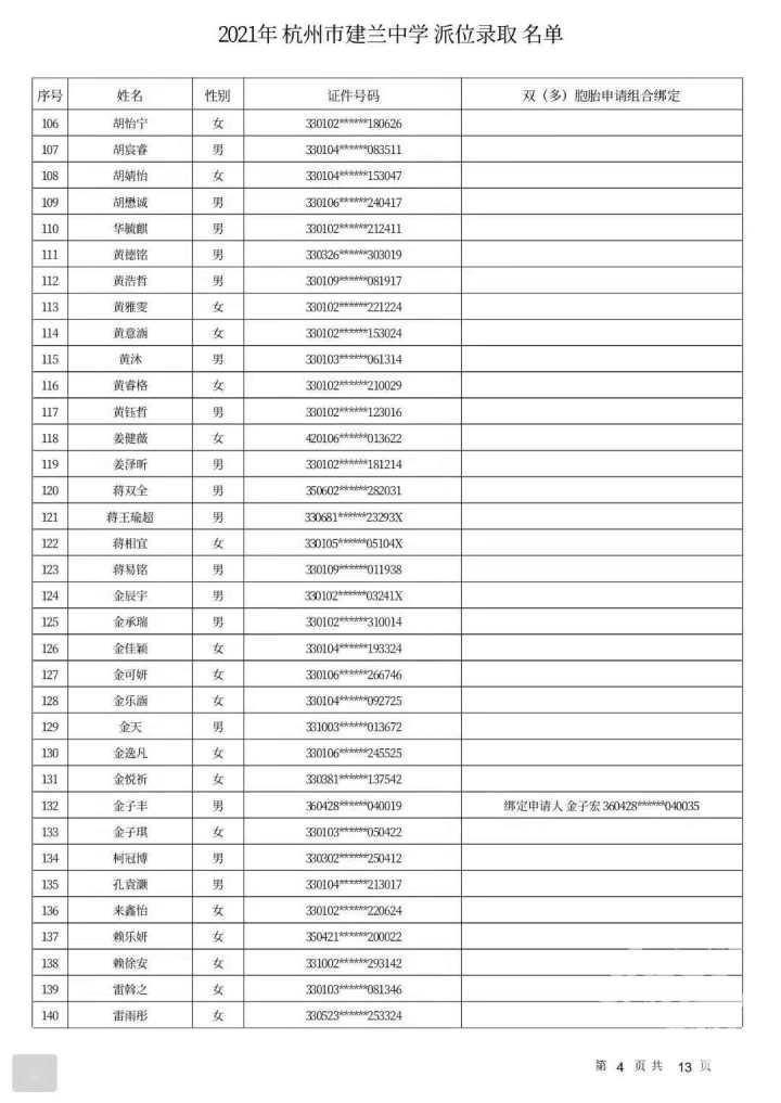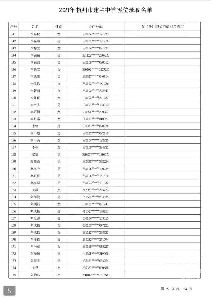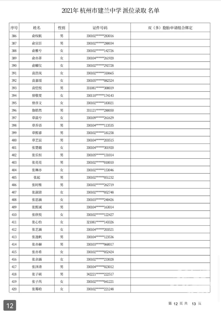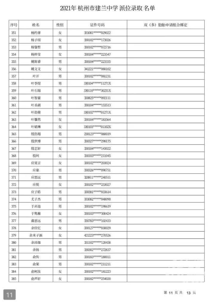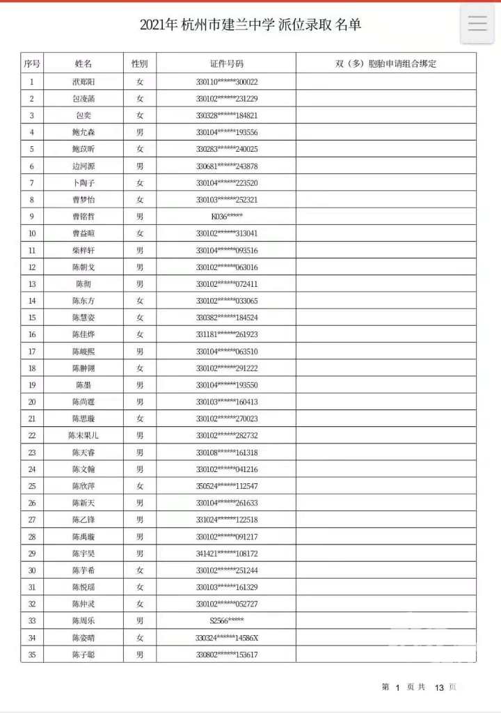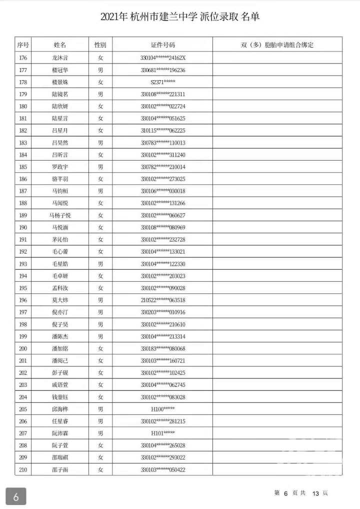 杭州市建兰中学录取名单