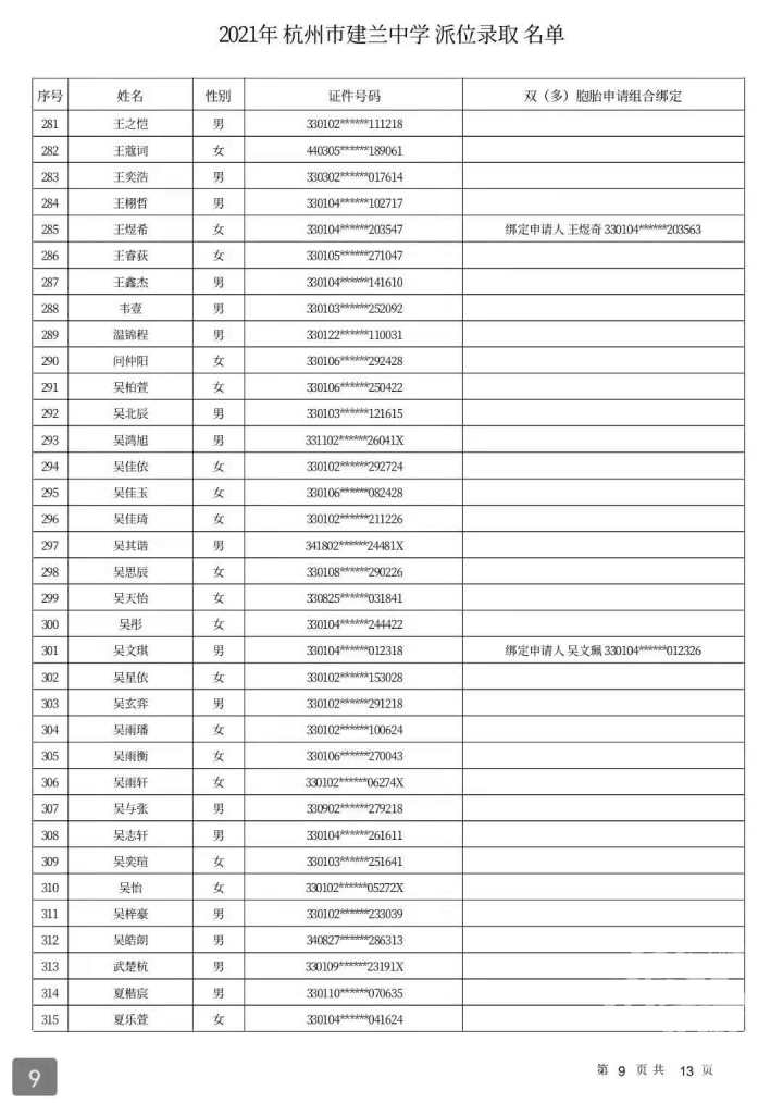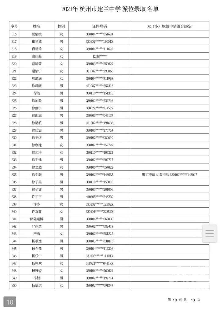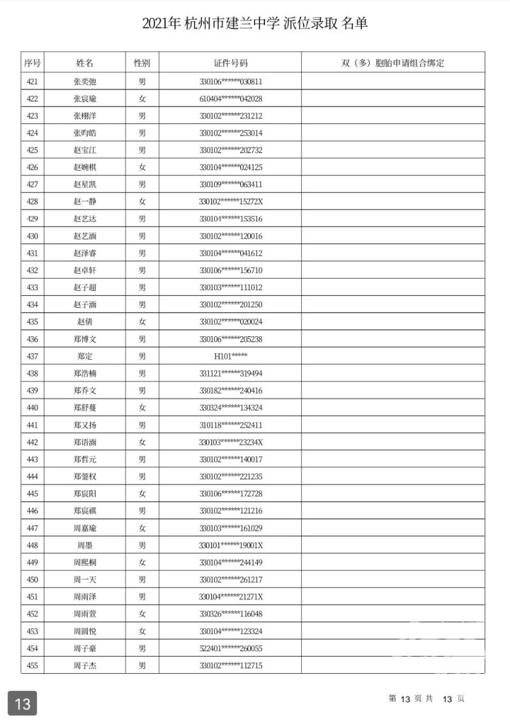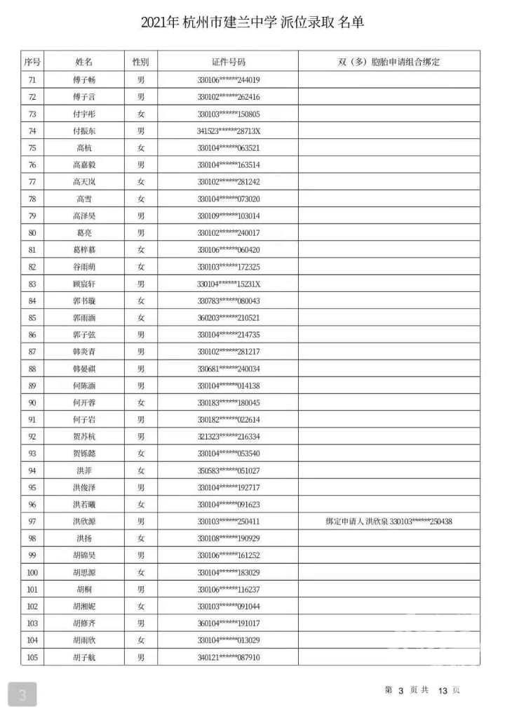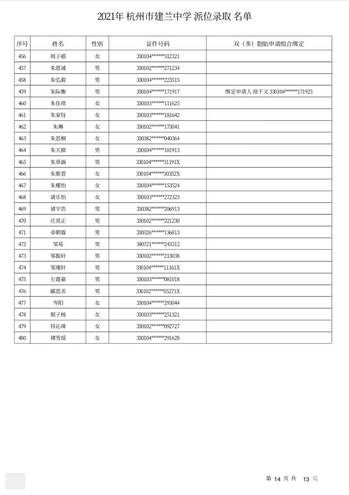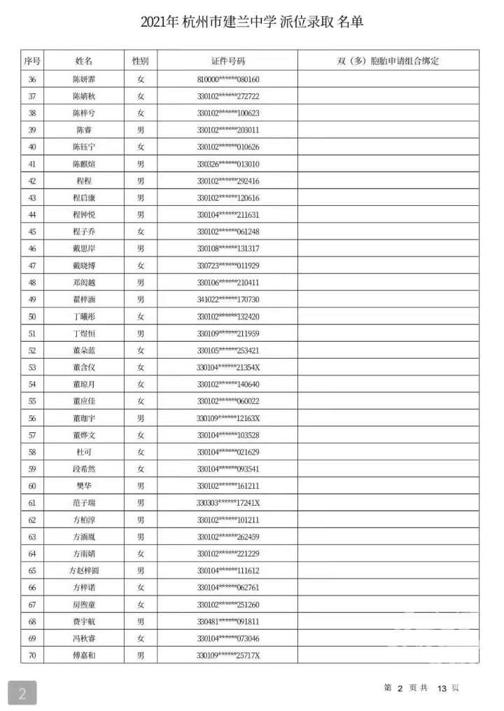 杭州市建兰中学录取名单