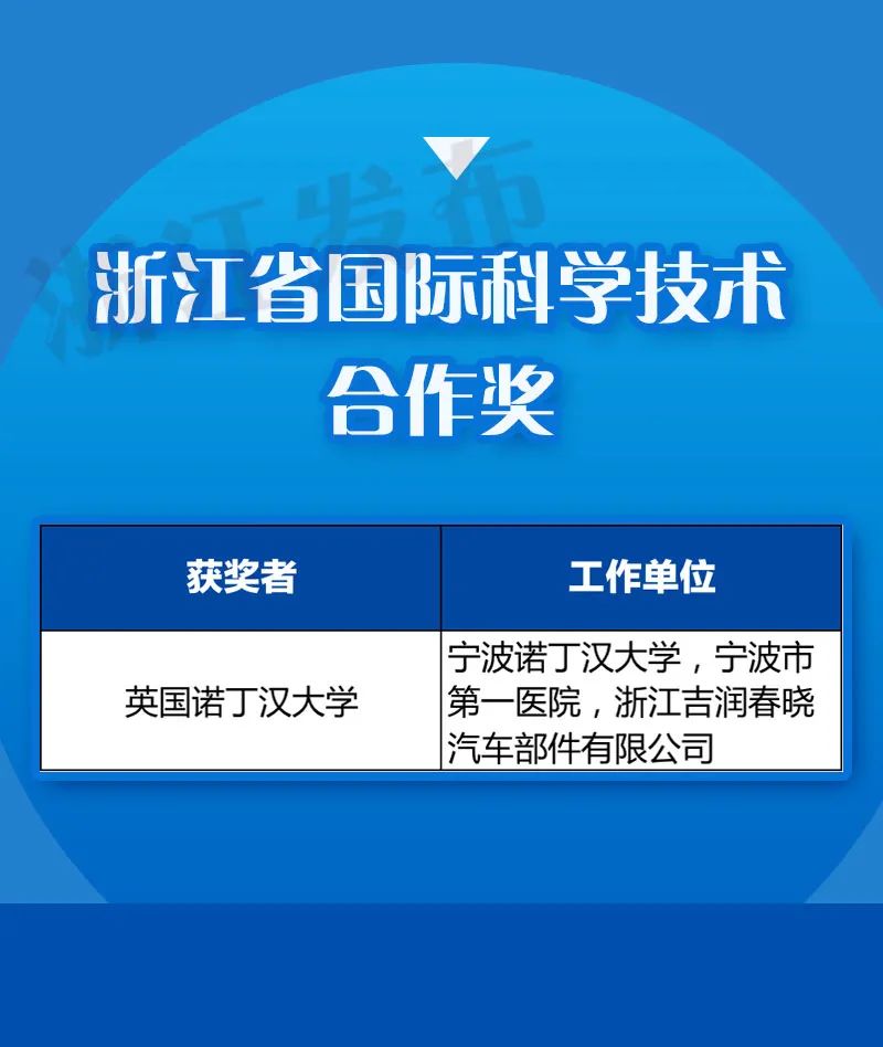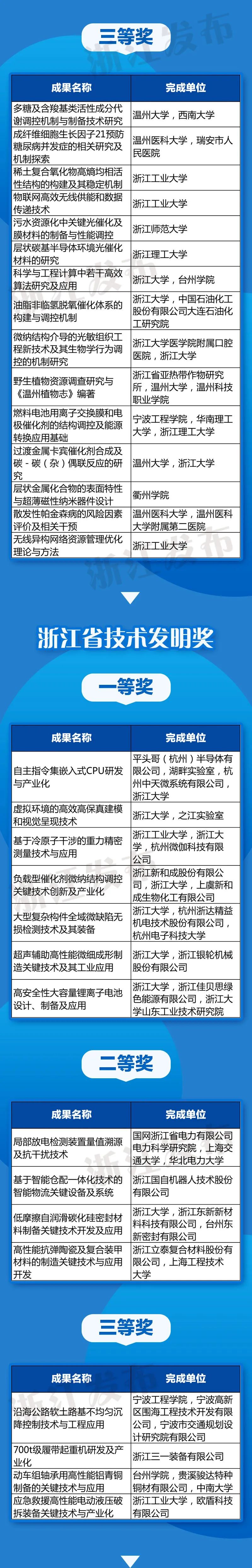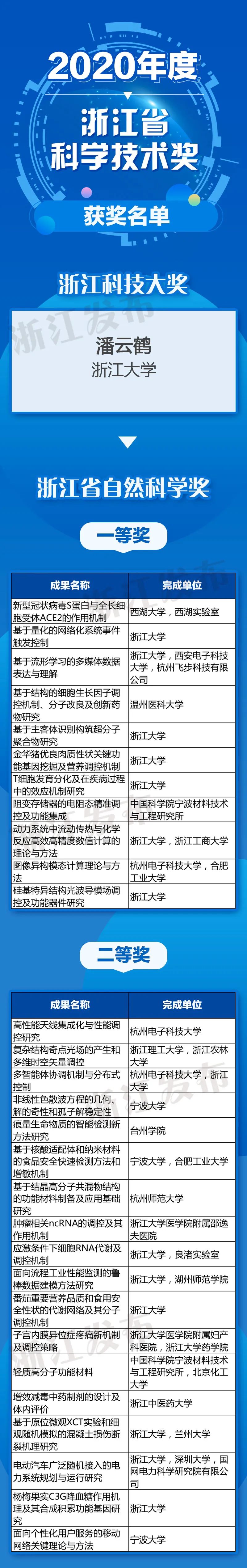 会上,颁发301项2020年度浙江省科学技术奖,其中浙江科技大奖1项,由潘云鹤院士获得;299项成果(项目)获省自然科学奖、技术发明奖和科学技术进步奖,其中一等奖44项、二等奖90项、三等奖165项;国际科学技术合作奖1项,由英国诺丁汉大学获得。
