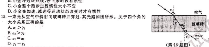 第15题:一束光从空气中斜射向玻璃砖并穿过,其光路如图所示。关于四个角的大小关系正确的是________。
