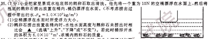 第35题:(7分)小金把家里景观水池底部的鹅卵石取出清洗。他先将一个重为10N的空桶漂浮在水面上,然后将池底的鹅卵石捞出放置在桶内,桶仍漂浮在水面。(不考虑捞出过程带出的水)