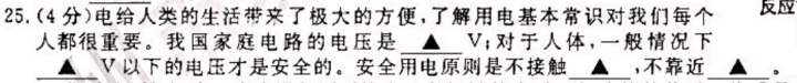 第25题:(4分)电给人类的生活带来了极大的方便,了解用电基本常识对我们每个人都很重要。我国家庭电路的电压是 __________V;对于人体,一般情况下_________V以下的电压才是安全的。安全用电原则是不接触_________,不靠近_________。