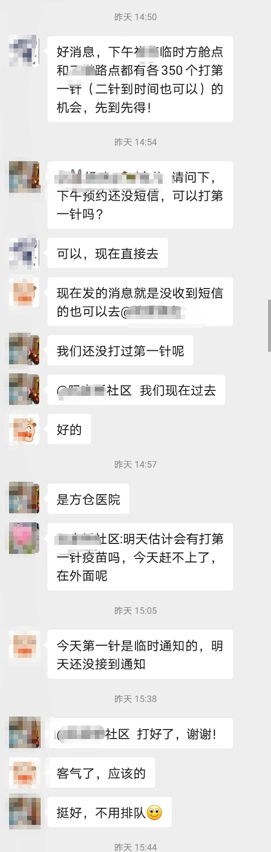 都市快报报道 “好消息,下午***临时方舱点和**点都有350个打第一针(二针到时间也可以打)的机会,先到先得。”