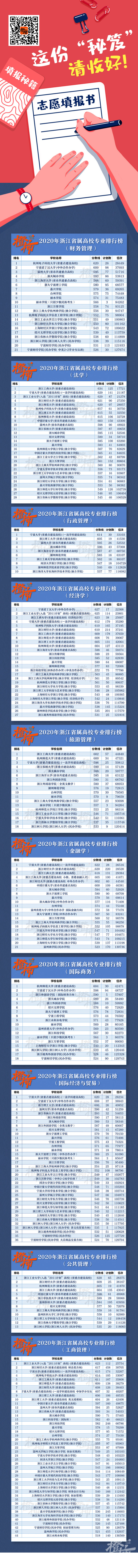 这40张榜单中,包含了金融学、建筑学、小学教育、法学、电子信息等省内高校开设的热门专业,我们按照去年的录取分数线和位次进行了排序,让考生和家长能够“一目了然”。比如,有志于填报金融学专业的考生,可以在榜单中看到所有开设金融学专业的浙江省属高校名单,其中,去年录取分数线最高的是宁波大学,622分,位次26516;其次是浙江财经大学,620分,位次28520。