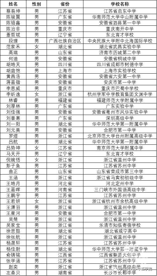 根据录取名单,浙江省录取的学生分别来自杭州学军中学教育集团文渊中学、浙江省杭州高级中学、浙江省杭州市余杭区高级中学、北京师范大学台州附属高级中学、浙江省温州中学、浙江省马寅初初级中学、乐清市知临寄宿学校。其中浙江省温州中学表现突出,有4人上榜。