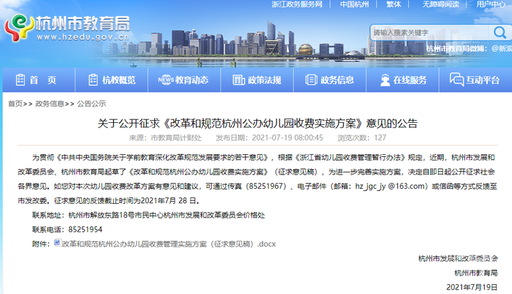 其中提到,近期,杭州市发展和改革委员会、杭州市教育局起草了《改革和规范杭州公办幼儿园收费实施方案》(征求意见稿),为进一步完善实施方案,决定自即日起公开征求社会各界意见。新的收费标准自2021年秋季开学起执行,原在园幼儿保教费仍按原规定的收费标准执行到离园为止。