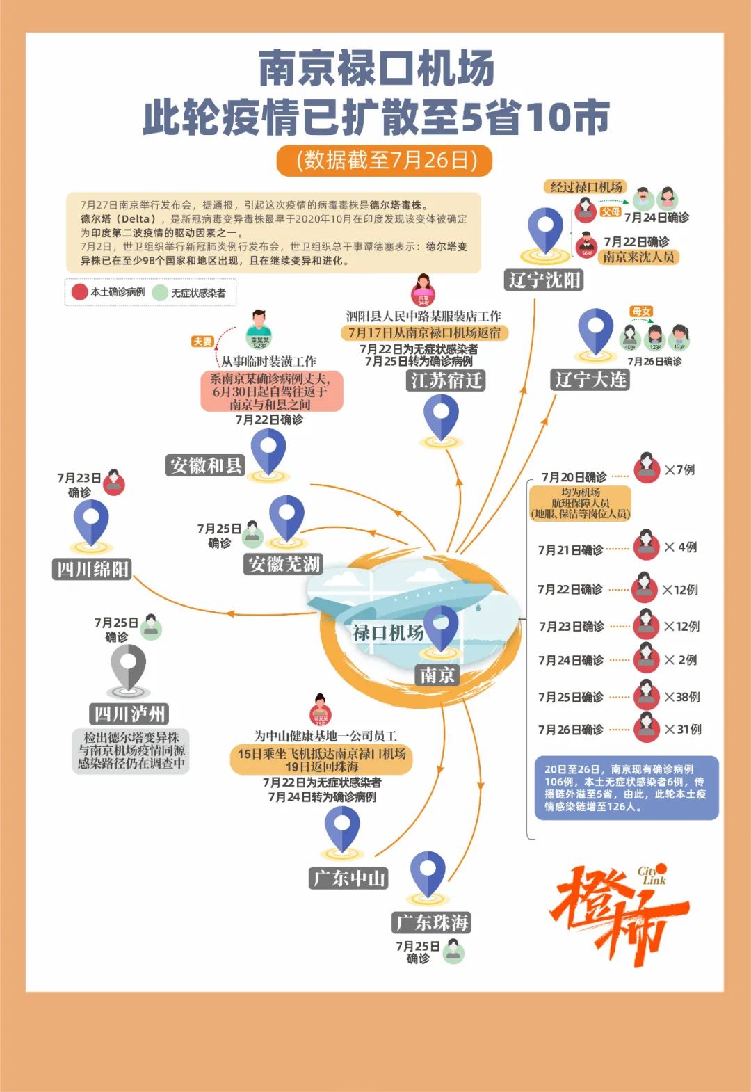 20日至26日,南京现有确诊病例106例,本土无症状感染者6例,传播链外溢5省,共报告14例相关联感染者,由此,此轮本土疫情感染链增至126人。