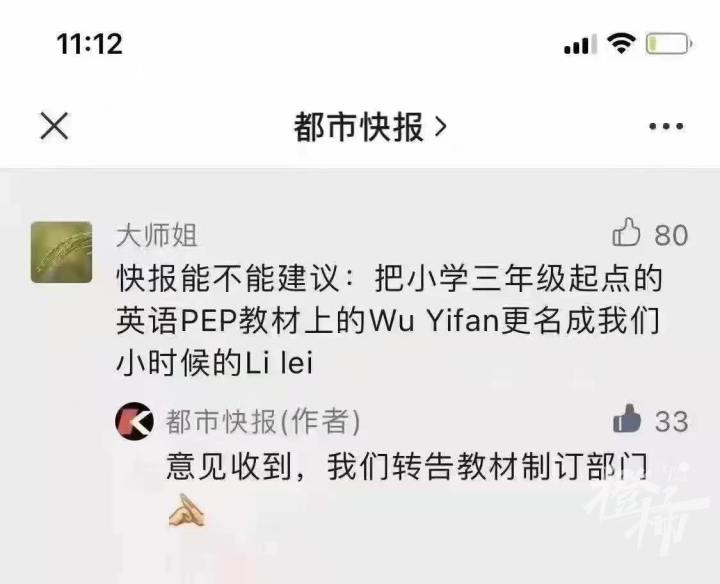 都市快报讯 最近,娱乐明星吴某凡涉嫌强奸罪被依法刑拘的新闻被曝出后,有读者在都市快报官微文章下留言:能不能把小学三年级英语PEP教材中的WuYifan更名成我们小时候的Li lei?