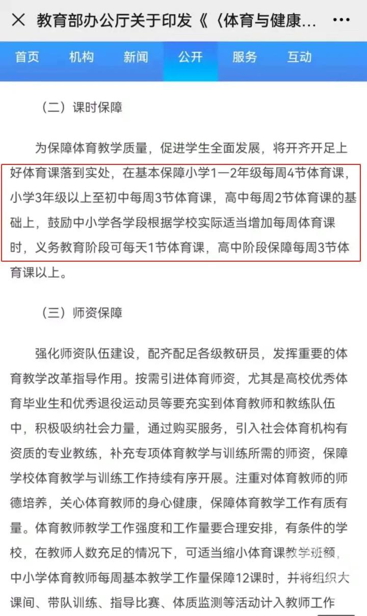 一所公办小学的教导处负责人说,今年4月份,浙江省教育厅官微“教育之江”就发布了教育部印发的《关于进一步加强中小学生体质健康管理工作的通知》,对中小学生体育看课和锻炼时间提出具体要求,并且要求更高。