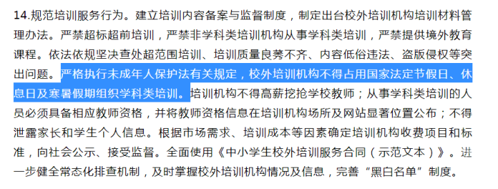 日前,中共中央办公厅、国务院办公厅印发了《关于进一步减轻义务教育阶段学生作业负担和校外培训负担的意见》,并发出通知,要求各地区各部门结合实际认真贯彻落实。这则《意见》也被称作“双减”,其中对于校外培训机构提出多项监管要求,包括“校外培训机构不得占用国家法定节假日、休息日及寒暑假期组织学科类培训”等。