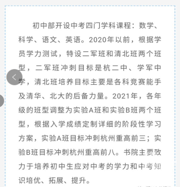 其中提到,2021年,各年级的班型调整为实验A班和实验B班两个班型,根据入学成绩定制详细的阶段性学习方案,实验A班目标冲刺杭州重高前三;实验B班目标冲刺杭州重高前八。书院主要致力于培养初中生应对中考的学力和中考知识培优、拓展、提升。