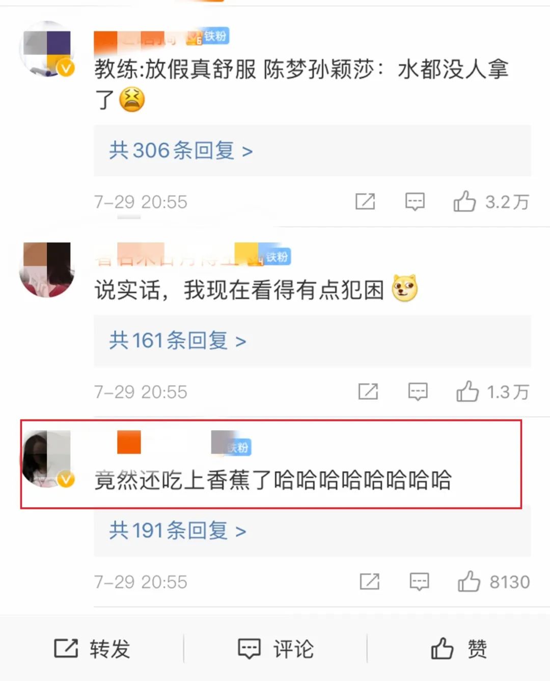 在评论区,不少网友表示被萌化了,有的说自己看完也拿出了一根香蕉。细心网友发现,陈梦不止在东京奥运会乒乓球比赛现场吃香蕉,在其他比赛时也有吃香蕉的习惯。其实,在不少耗体能的赛事中,很多运动员都会在休息时吃香蕉。