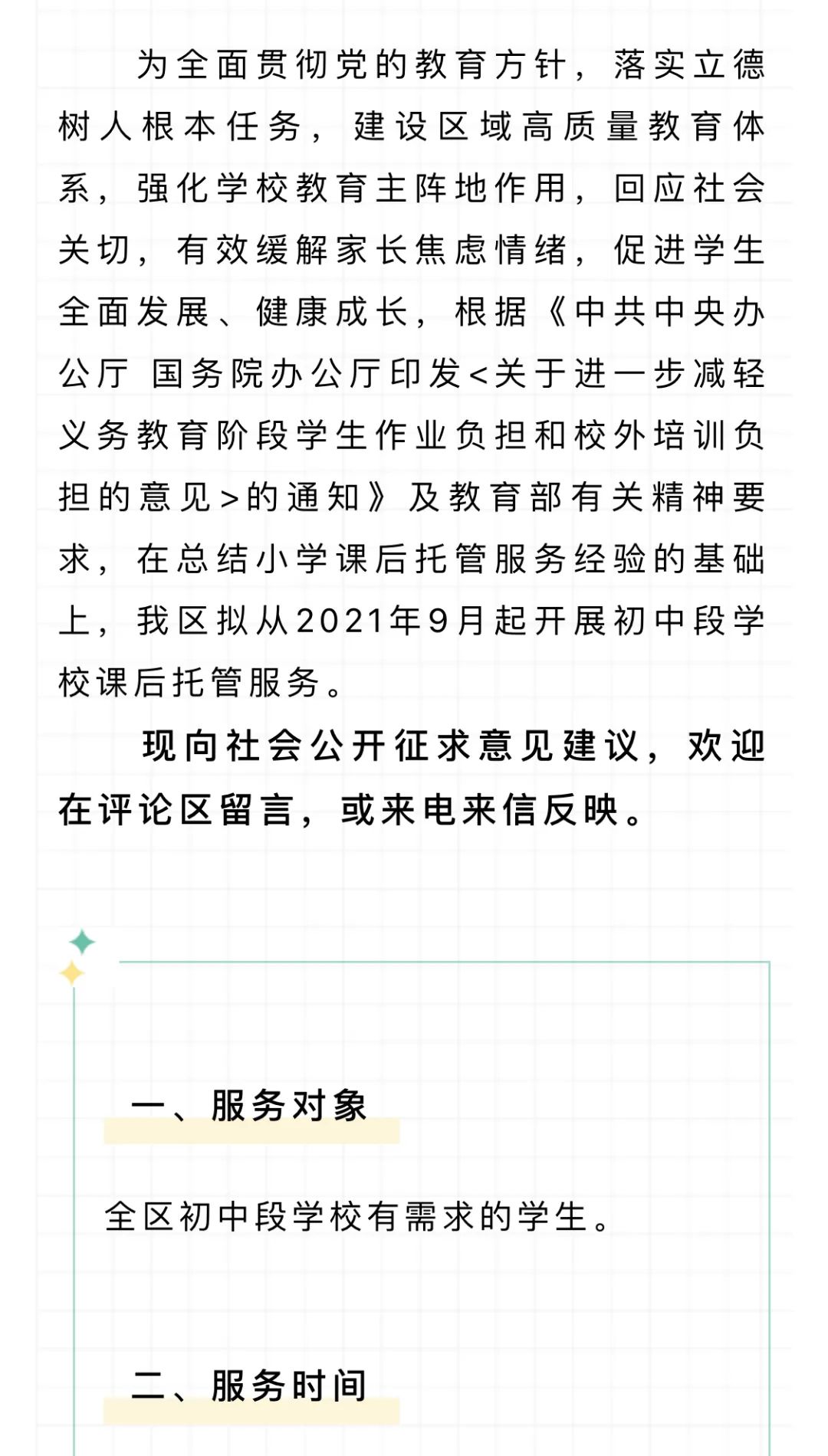 在总结小学课后托管服务经验的基础上,宁波北仑区拟从2021年9月起开展初中段学校课后托管服务。8月16日,该区教育局向社会公开征求意见建议。