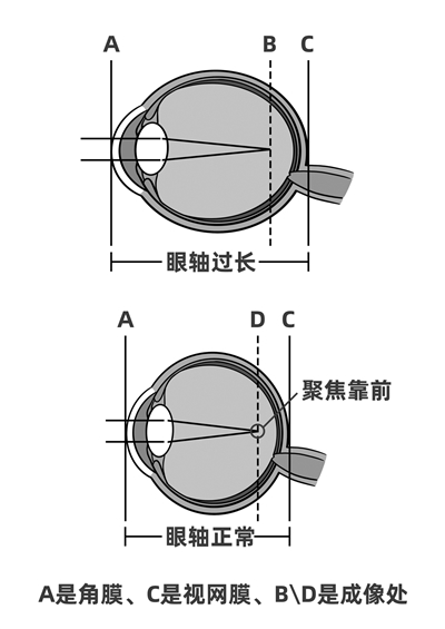 一般而言,当我们的眼轴(眼角膜到视网膜之间的距离)变长时,视网膜位置会后退;当角膜与晶状体状态发生改变时,其折射能力会随之改变。这两种的情况都将导致外界平行光线聚焦在视网膜前方,造成视网膜成像模糊,这便是近视形成的原理。