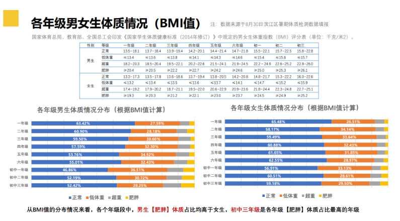 在这些跳动的数据中,小狮妹发现了一些有趣的数据结论:从BMI值的分布情况来看,各个年级段中,女生“正常”体质占比均高于男生,初中三年级是各年级“肥胖”体质占比最高的年级。