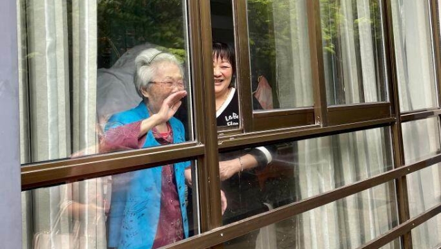周老师站在窗边,妈妈扶着窗台,两个人轻声地说着话。周老师问妈妈有没有交到新朋友,妈妈高兴地拍着身边保姆的肩膀:“有,有,她们都是我的好朋友!还有这里的医生护士,都叫我奶奶,对我真当好!”阳光有点耀眼,周老师头上沁出了一些密密的汗珠,但两个人的神情,都那么愉悦,让人想起顾城的诗句:“阳光照在草上/我们站着/扶着自己的门扇/门很低,但太阳是明亮的/草在结它的种子/风在摇它的叶子/我们站着,不说话/ 就十分美好”。虽然因为疫情,让亲人的相见有些阻隔,但亲情是隔不断的。