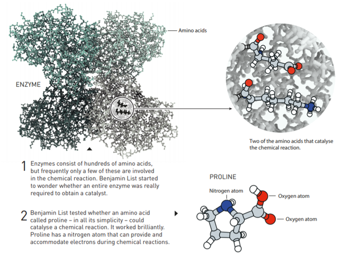 另一位诺奖得主本亚明·利斯特在研究催化抗体(catalytic antibodies)期间开始思考酶的实际工作原理。在没有任何预期的情况下,他测试了脯氨酸是否可以催化羟醛反应,这个简单尝试的结果出乎意料的好。通过实验,本亚明·利斯特不仅证明脯氨酸是一种有效的催化剂,而且证明这种氨基酸可以驱动不对称催化。2000 年 2 月,他发表了这一发现,并将有机分子参与的不对称催化描述为一个充满机会的新概念:“对这些催化剂的设计和筛选是我们未来的目标之一”。