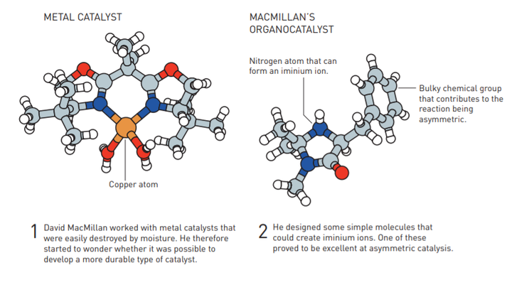 2000年,戴维·麦克米伦在思考金属不对称催化难以进行工业应用的问题时,他发现那些敏感金属使用起来实在是太麻烦、太贵了。于是,他选择了结构简单,且廉价易设计的有机分子,在测试中,他发现有机分子发挥了优秀的催化作用,其中一些有机分子在不对称催化方面也表现出色。为了研究方便,戴维·麦克米伦用“有机催化(organocatalysis)”这一术语来描述该方法。