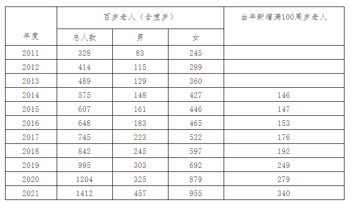据统计,杭州市百岁老人(含虚岁)2010年只有310位,到2021年达到1412位。近几年来,当年新增满100周岁的老人在百人以上,并逐年递增,今年更是达到340人。